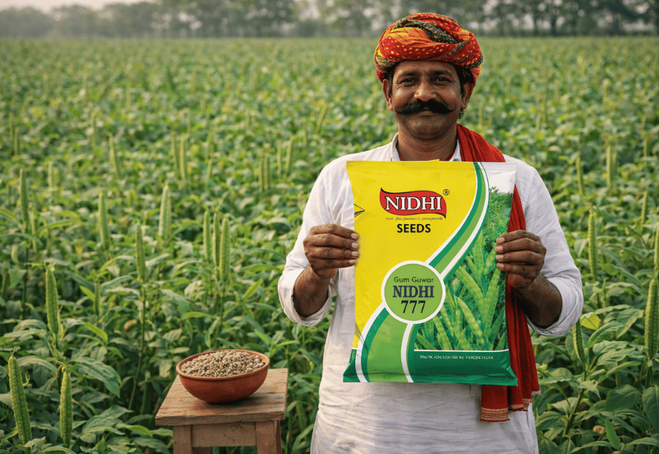 NIDHI-777 is a high-yielding gum guvar variety suitable for irrigated and unirrigated conditions, known for clustered pod formation and stable performance.