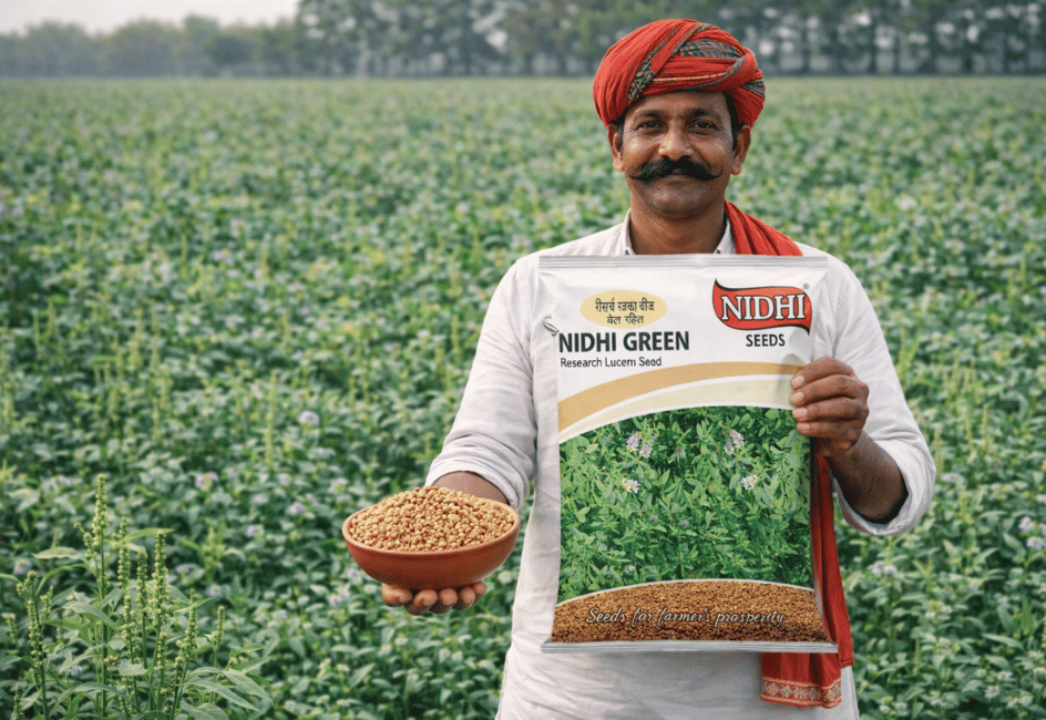 NIDHI-GREEN is a high-protein multicut lucerne variety with excellent regeneration, dark green foliage, and reliable fodder yield for one full year.