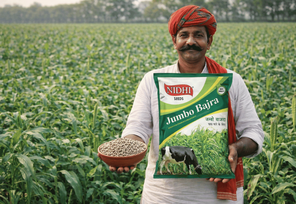 NIDHI-JUMBO is a high-performance fodder bajra hybrid developed for multiple cuttings and superior fodder quality. It shows excellent rejuvenation after each cut, strong stem strength, and wide adaptability to dry, irrigated, and waterlogged conditions. With high protein content and digestibility, it supports better animal health and productivity.