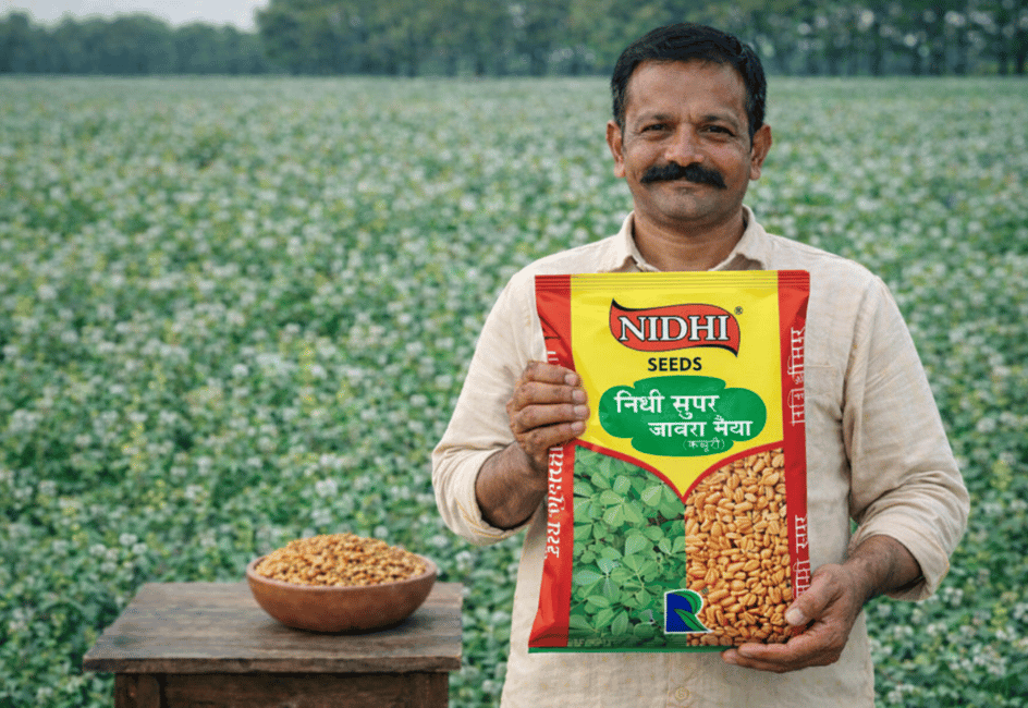 NIDHI-SUPER is a quick-growing, dual-purpose fenugreek variety with bold yellow grains, higher protein content, and tolerance to root rot disease.